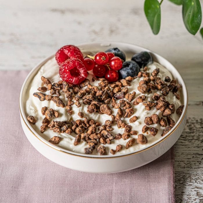 Una volta solido, immergilo nella Protein Bliss e guarnisci con Crunchy Cao.